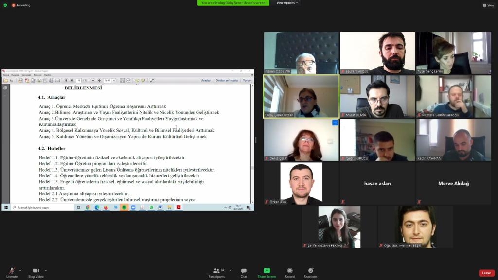 Yüksekokulumuz Bölümlerinin Stratejik Hedef ve Göstergelerinin hazırlanmasına ilişkin olarak 13 Ocak 2021 Çarşamba günü saat 16.30'da (Yönetim ve Organizasyon) Bölüm başkanımız Öğr. Gör. Dr. Gülay ŞENER UZCAN tarafından Zoom Meeting üzerinden çevrimiçi bilgilendirme toplantısı yapılmıştır.